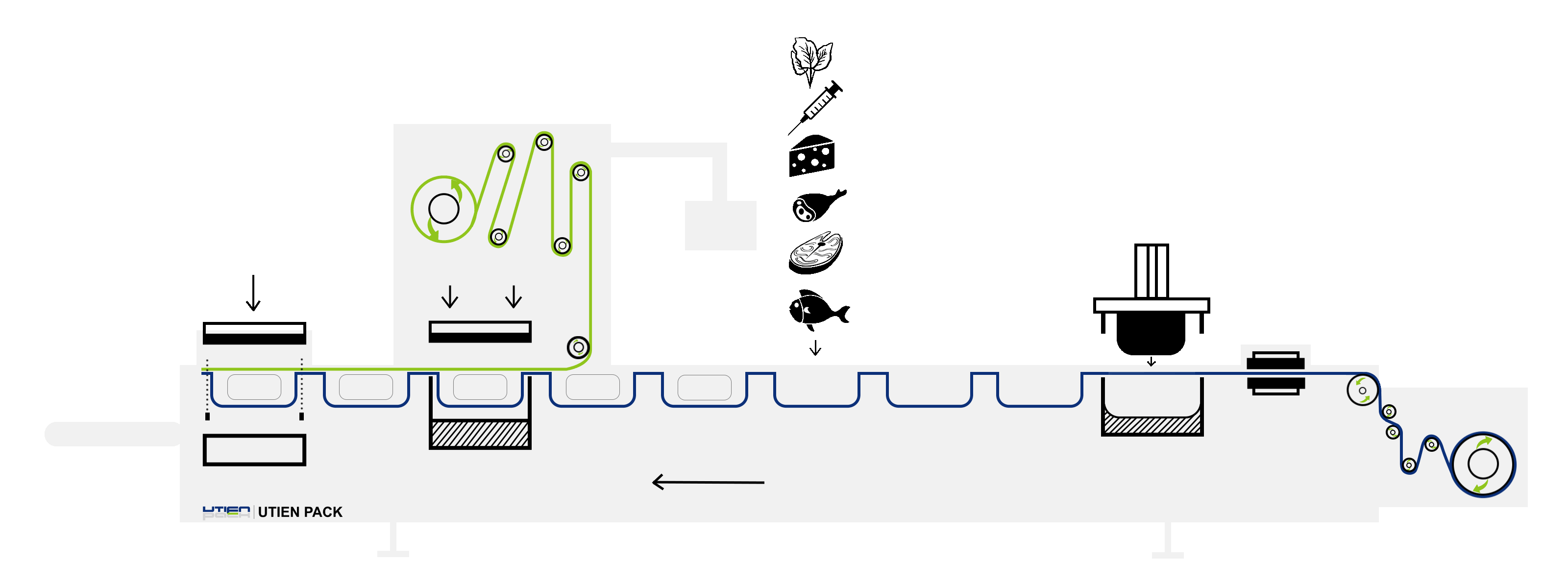 ?运作方式:采用硬膜连续式热成型结构,集成型、填充、真空充气封口、整切功能,可联动整线系统稳定运转。