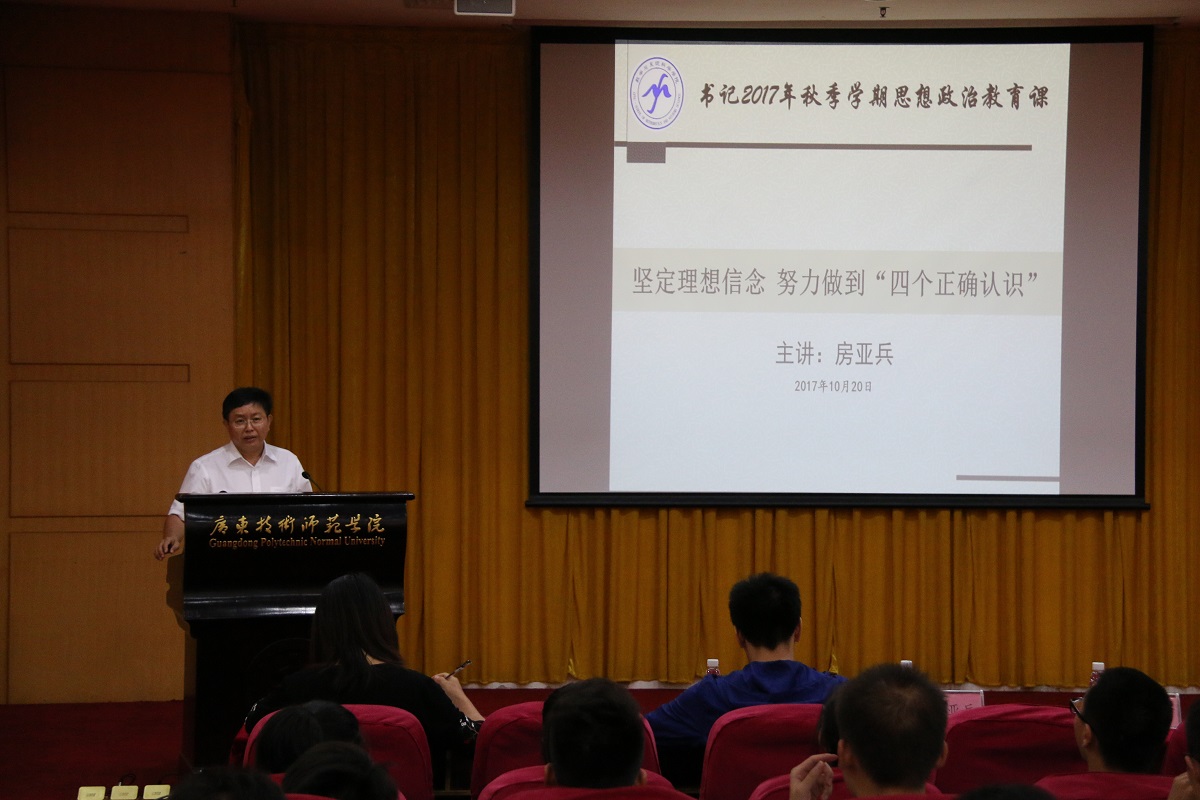 2017年10月20日在校本部第一教学楼208室,学院党总支房亚兵书记给学生干部和学生代表,作了题为《坚定理想信念,努力做到“四个正确认识”》的2017年书记秋季学期思想政治教育课。他以典型的历史资料为例,首先对理想信念的深刻内涵进行了深入讲解,认为当代大学生应把实现社会主义核心价值观培养成自己的理想信念。同时,结合学习党的十九大和全国高校思想政治工作会议精神,对大学生如何做到正确认识世界和中国发展大势、如何做到正确认识中国特色和国际比较、如何做到正确认识时代责任和历史使命、如何做到正确认识远大抱负和脚踏实地等问题进行了深入阐述。(太阳成集团tyc122cc入口)
