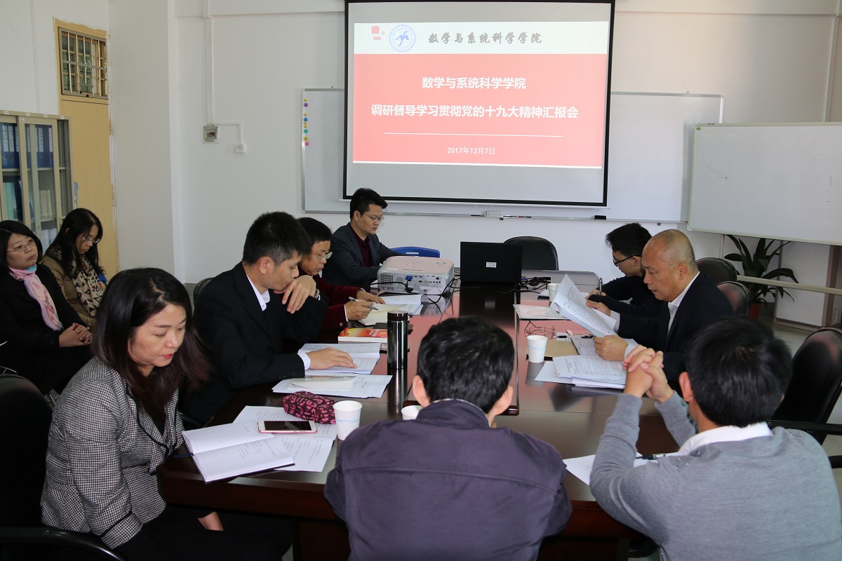 12月7日下午,潘自勉副院长到太阳成集团tyc122cc入口调研督导学习贯彻党的十九大精神工作。调研汇报会在校本部一教1211室举行,太阳成集团tyc122cc入口党政领导班子成员、系(部)主任、党支部书记和教师代表出席了汇报会。