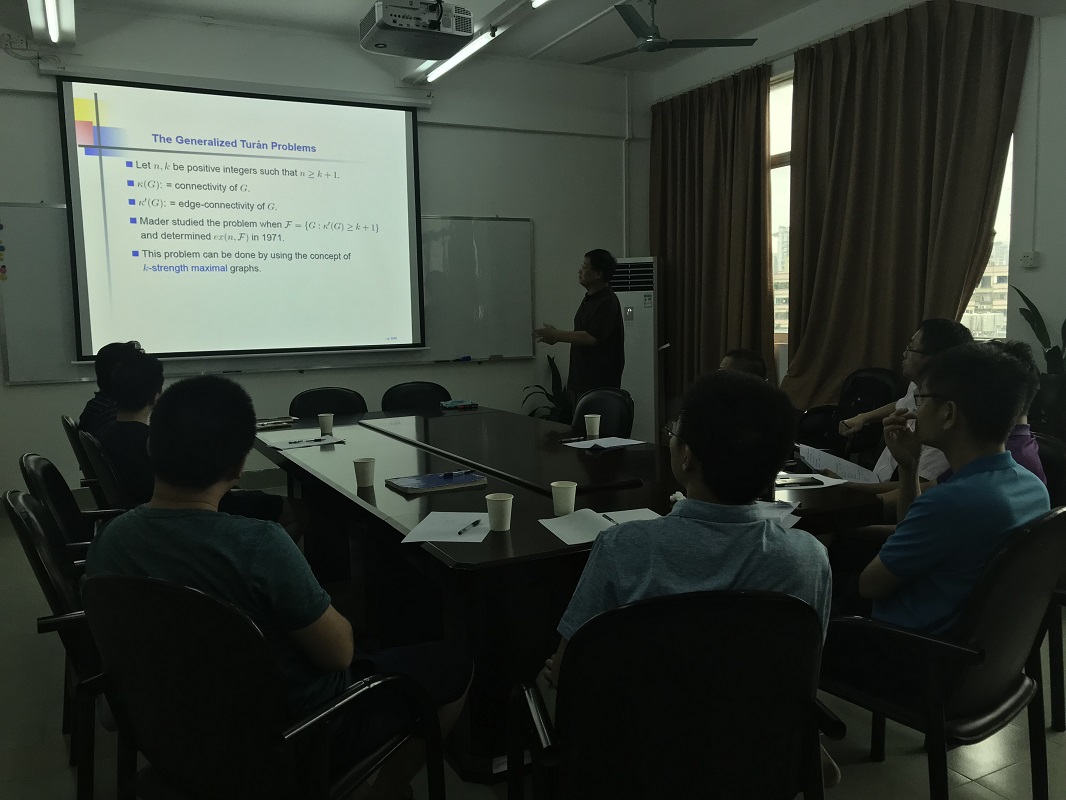 2018年7月2日下午3点,美国西弗吉尼亚大学赖虹建教授应学院邀请,在校本部第一教学楼1211室,为我们做了题为《图的广义Turan问题》的学术报告。该报告展现了最近在图的广义Turan问题和广义Turan函数的研究方面的一些结果。报告后,数学学院老师热烈积极参与讨论,并和赖教授交流相关学术问题。