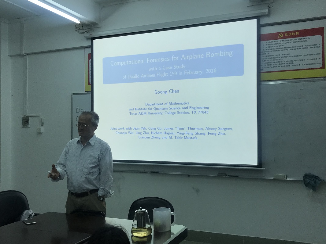 2018年11月21日下午,美国德克萨斯A&M大学(Texas A&M University)的Goong Chen 教授和中山大学黄煜教授应邀到我院作学术报告。报告会在校本部第一教学楼1211室举行。学院领导梁海华,以及对此课题方向感兴趣的老师、研究生、本科生参加了报告会。