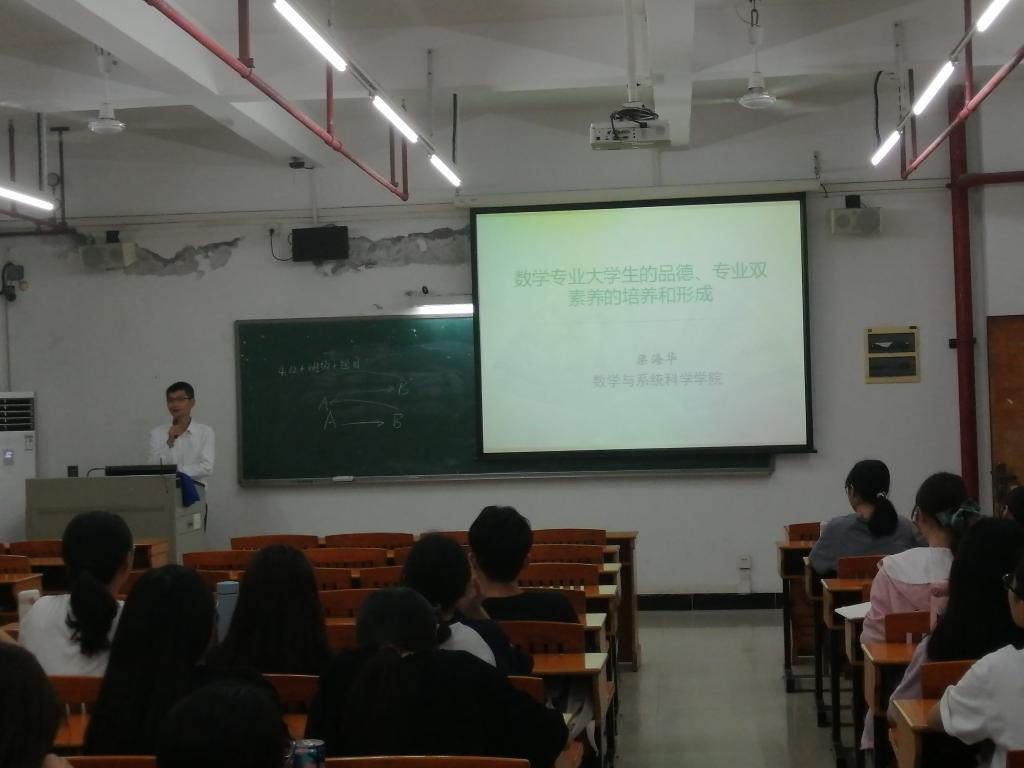 为贯彻落实全国高校思想政治工作会议精神,进一步加强我院学生的思想政治教育,引导学生在专业成长的同时养成高尚的思想品德,4月14日晚上,梁海华院长在白云校区二教604课室为19级数学与应用数学(师范)专业的同学讲授了题为“数学专业学生的品德和专业素养的培养和形成”的专题思政课。