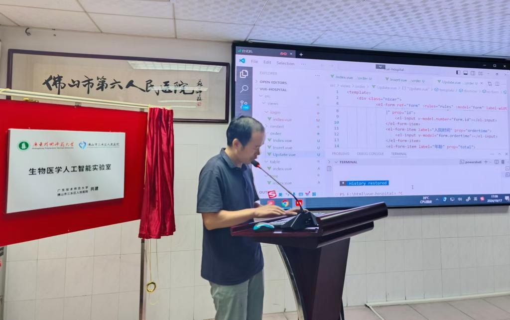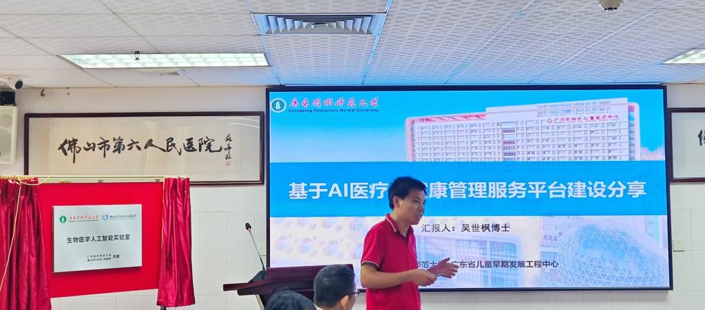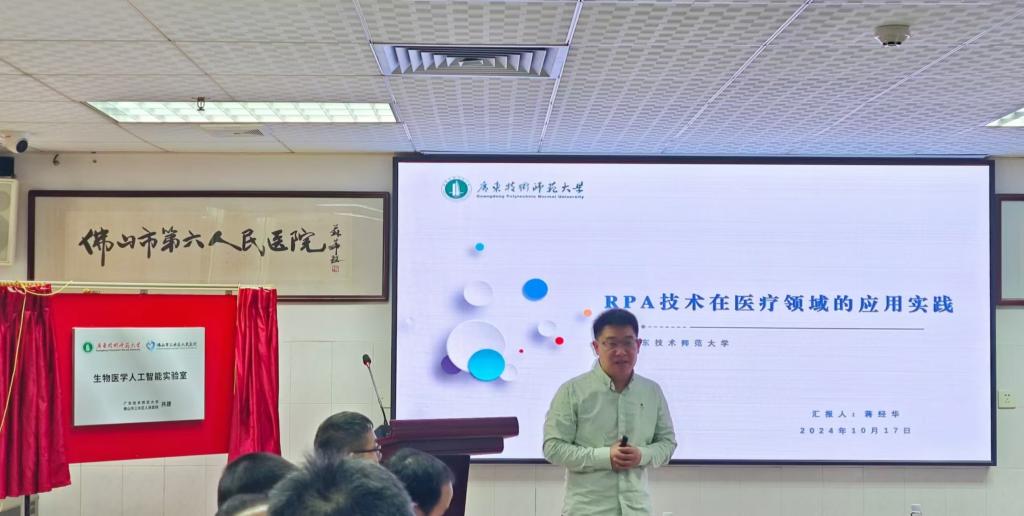 2024年10月17日,广东技术师范大学数学与系统科学院与佛山市三水区人民医院合作共建“生物学人工智能实验室”揭牌仪式在佛山市三水区人民医院行政楼会议室举行。太阳成集团tyc122cc入口梁海华院长、许国良副书记、李振彰主任、蒋经华主任、吴世枫博士、彭雪博士、易宗向博士,佛山市三水区人民医院潘磊副院长、科教科曾雪花科长、科教科张帆副科长、财务科莫静明副科长、医务科胡朝晖副科长、医务科罗婉霞副科长、护理部潘婉玲副主任、科教技术委员会成员及重点专科负责人等20余人参加会议。会议由张帆副科长主持。