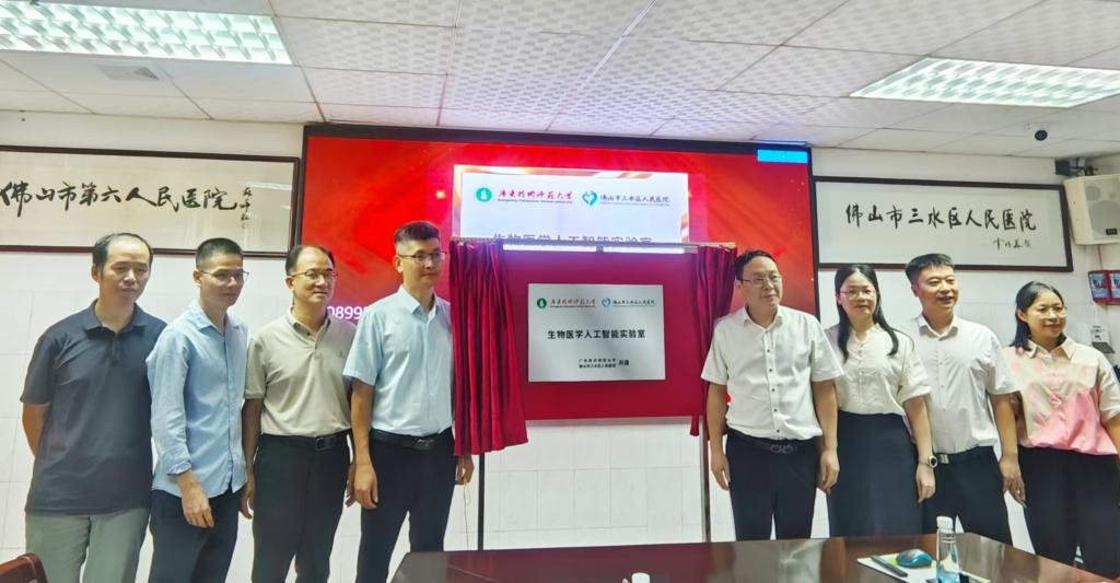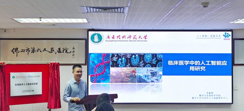 会议开始,潘磊致辞,对梁海华一行的到来表示热烈的欢迎,希望今后通过项目开展深度合作,努力打造一个高水准的生物医学人工智能实验室,为医院提供更加精准快捷便利的服务支撑。随后,梁海华介绍广东技术师范大学数学与系统科学院的实验室建设情况和李振彰主任团队的系列研究成果,希望今后学院与三水市人民医院共同打造一支高质量的生物医学与人工智能研究团队,走在医学健康领域发展的前沿,实现“医、教、研”的协同发展。之后与会人员一同为“生物医学人工智能实验室”揭牌。