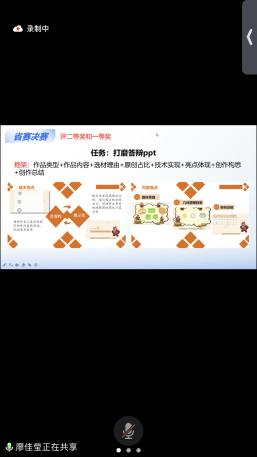 随后,2024年省赛二等奖获得者廖佳莹同学从多维视角展开深度分享首先,她结合参赛历程,系统解析了从校级选拔到省级决赛的晋级路径,着重强调选题创新需兼顾专业特色与教育价值随后通过拆解获奖作品完整呈现微课制作全流程,涵盖教学设计、脚本撰写、素材采集、动画制作等核心环节,并讲解万彩动画大师等工具的操作技巧在省赛答辩专题环节,重点剖析了答辩PPT设计要素及临场策略,强调了原创占比和突出技术亮点的重要性。分享过程中廖同学还穿插播放了部分省级一等奖作品案例,通过对比分析揭示优质作品共性特征。