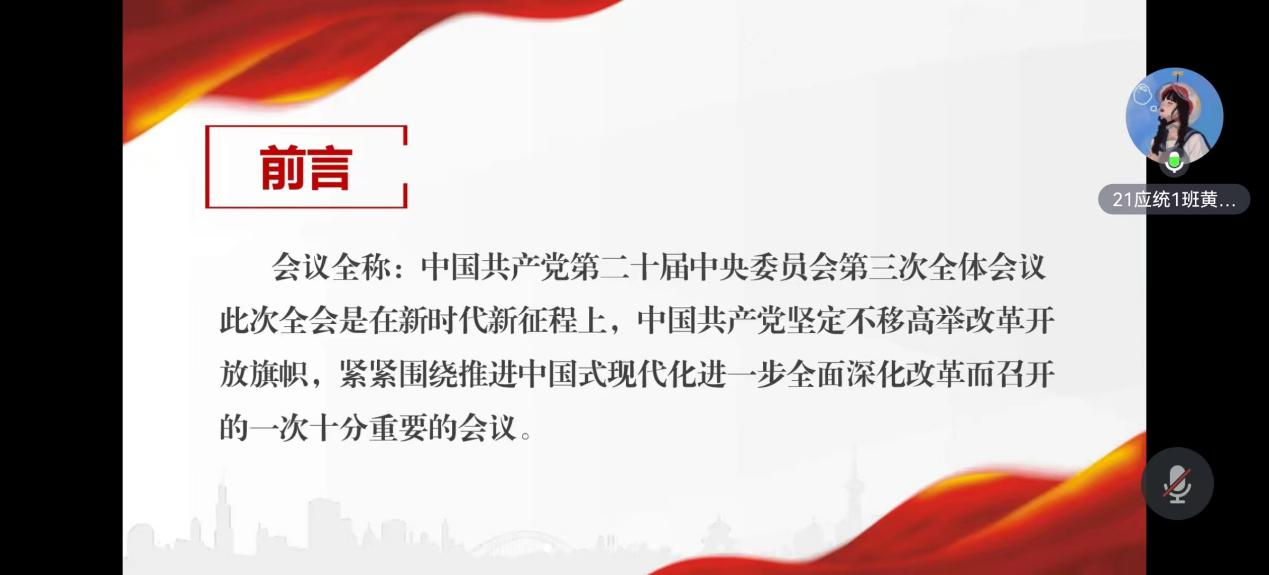 会上,由本科生党支部书记王婷婷传达党的二十届三中全会精神,全体党员共同学习。学生党员黄颖欣、吴仲贤作为党员代表作学习心得分享。